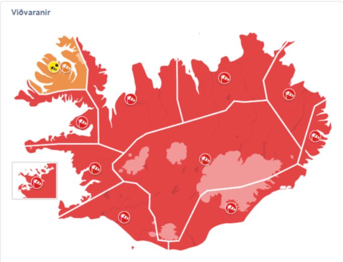 The Icelandic MET Office (www.vedur.is) has issued an orange weather warning for the whole country from this afternoon and flights to and from Iceland have been cancelled.