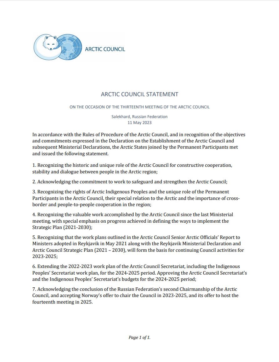 Arctic Council Statement - On the occasion of the thirteenth Meeting of the Arctic Council