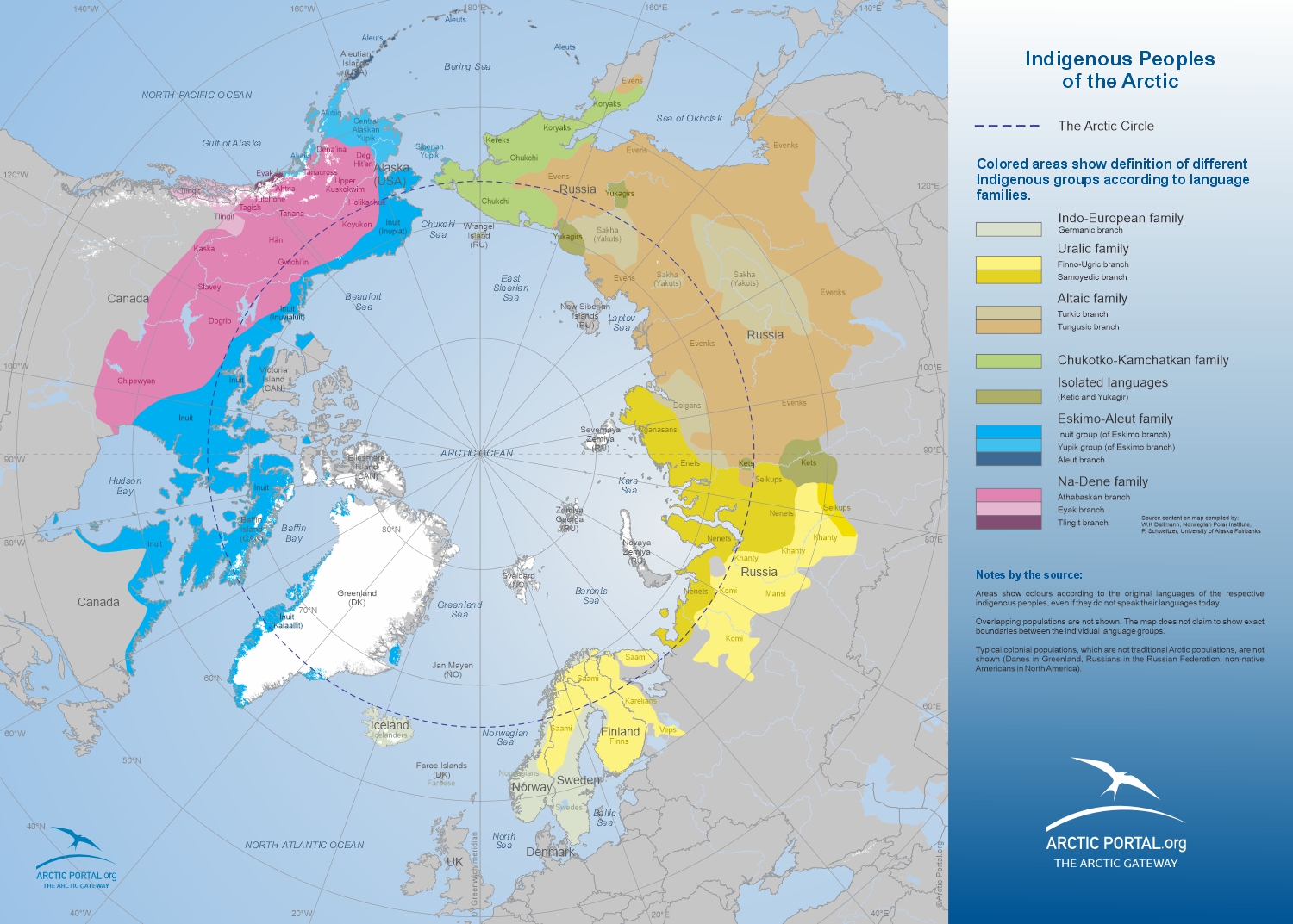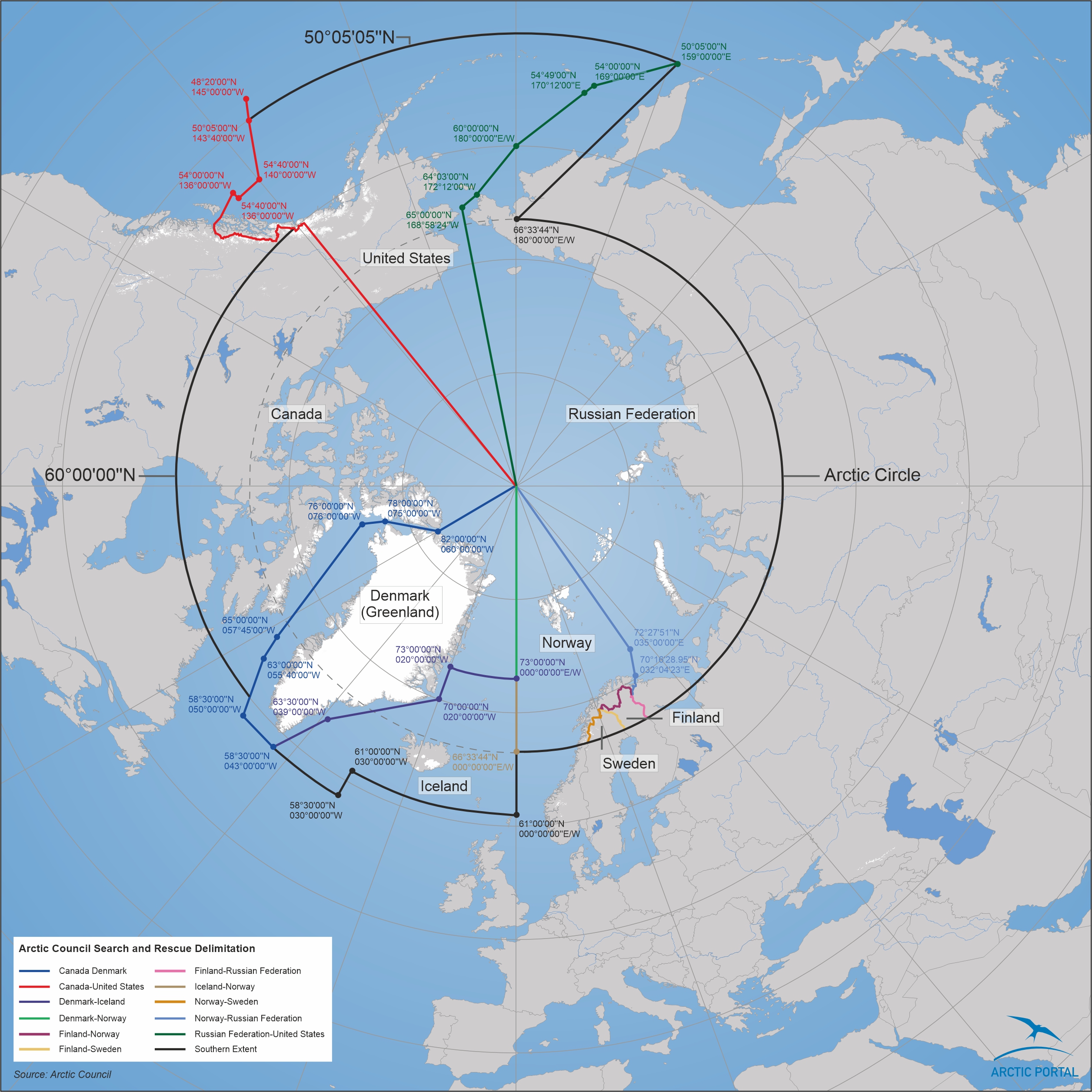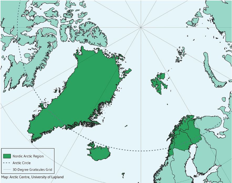 “all of Alaska, Canada North of 60°N together with northern Quebec and Labrador, all of Greenland, the Faroe Islands, and Iceland, and the northernmost counties of Norway, Sweden and Finland... [and in Russia,] the Murmansk Oblast, the Nenets, YamaloNenets, Taimyr, and Chukotka autonomus okrugs, Vorkuta City in the Komi Republic, Norilsk and Igarka in Krasnoyarsky Kray, and those parts of the Sakha Republic whose boundaries lie closest to the Arctic Circle” (pp. 17-18)