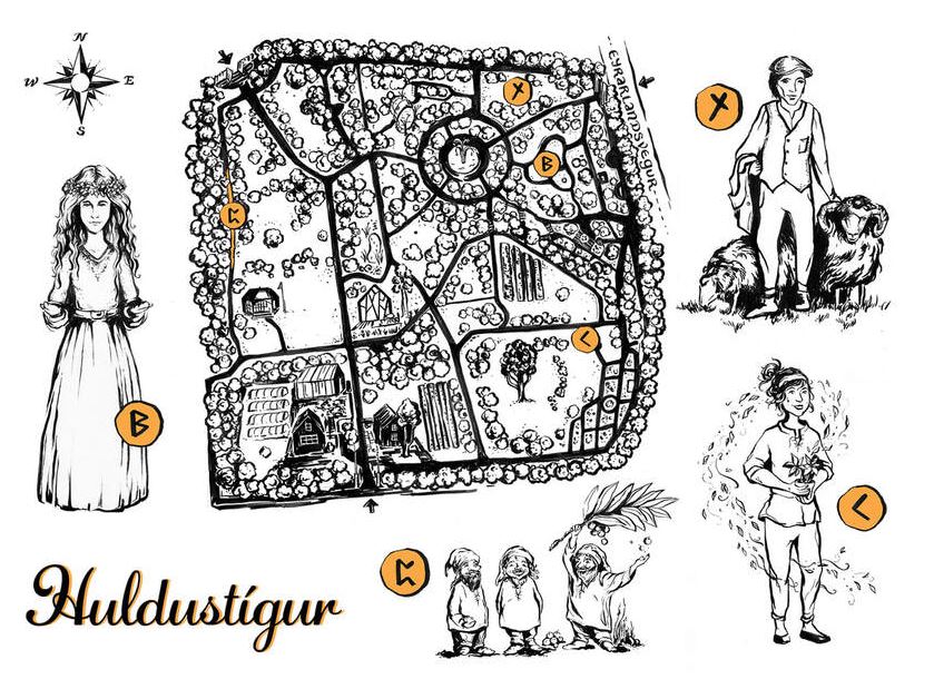 Some of these mystical inhabitants are permanent residents, while others reveal themselves when the flora blooms. Among the remarkable denizens is a hidden woman, named Pia, who tends to the Siberian apple tree year-round (marked on the map with a B). Her tree, which originated from a seed donated to Iceland by the Agricultural University of Ås in Norway, enticed her to follow its journey to Iceland, ultimately choosing to make it her home. The woman's uniqueness lies in her radiant health and luminous presence, making her tree an ideal place for visitors to offer prayers and seek guidance. Bryndís has mapped the Garden and created a trail of the Hidden People (Huldustígur). The map portrays the locations of Elves and Hidden beings who are open to engaging with humans. Not all Hidden People within the park are inclined to cooperate or partake in conversation, hence their omission from the map.