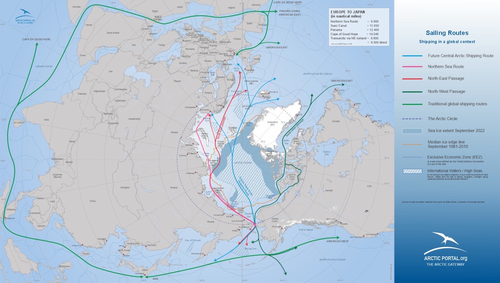 Maps made by Arctic Portal: Arctic Sea Routes with main ports, Sailing Routes - Shipping in a global context