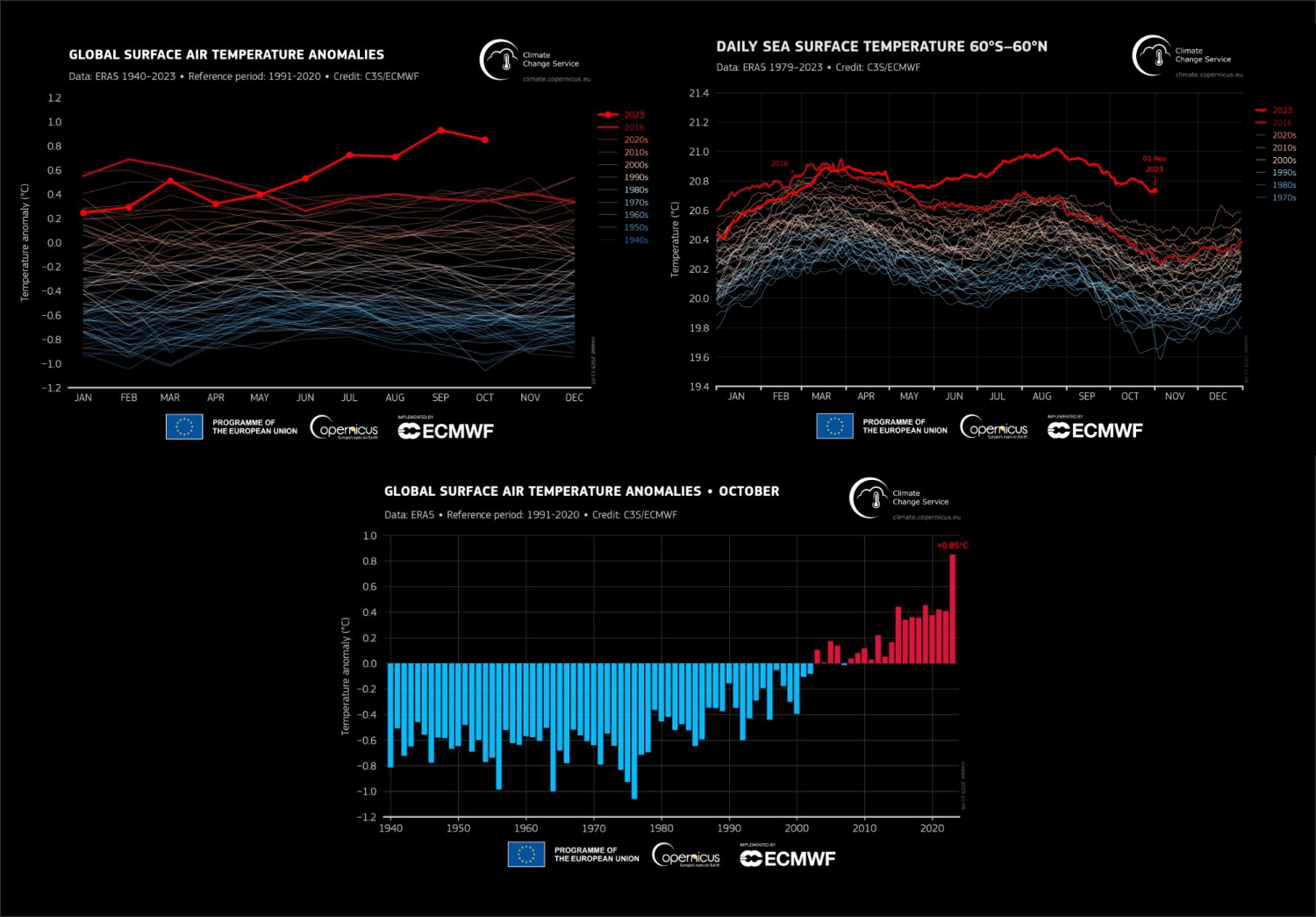 For Europe, October 2023 was the fourth warmest October on record, with temperatures 1.30°C higher than the 1991-2020 average. On a broader scale, sea surface temperatures reached a new high in October, with an average of 20.79°C between 60°S and 60°N.