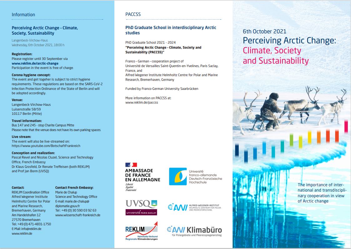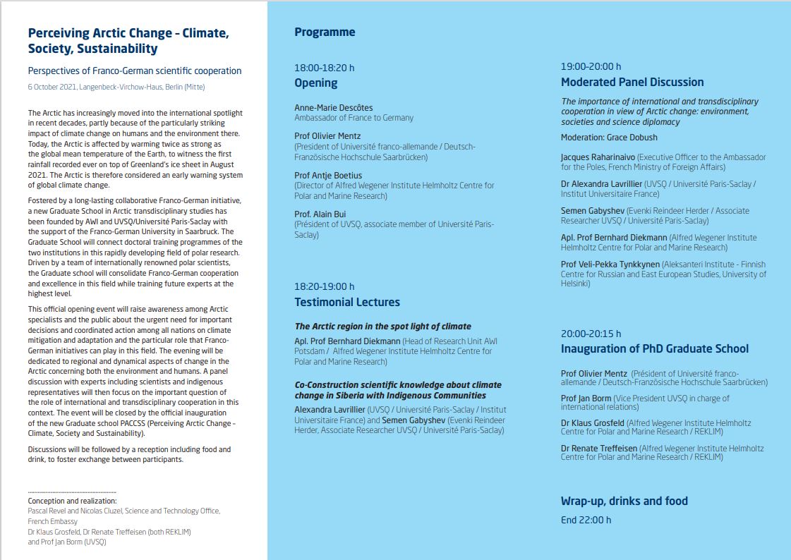 The official opening event will raise awareness among Arctic specialists and the public about the urgent need for important decisions and coordinated action among all nations on climate mitigation and adaptation and the particular role that Franco-German initiatives can play in this field. The evening will be dedicated to regional and dynamical aspects of change in the Arctic concerning both the environment and humans. A panel discussion with experts including scientists and indigenous representatives will then focus on the important question of the role of international and transdisciplinary cooperation in this context. The event will be closed by the official inauguration of the new Graduate school PACCSS (Perceiving Arctic Change - Climate, Society and Sustainability).