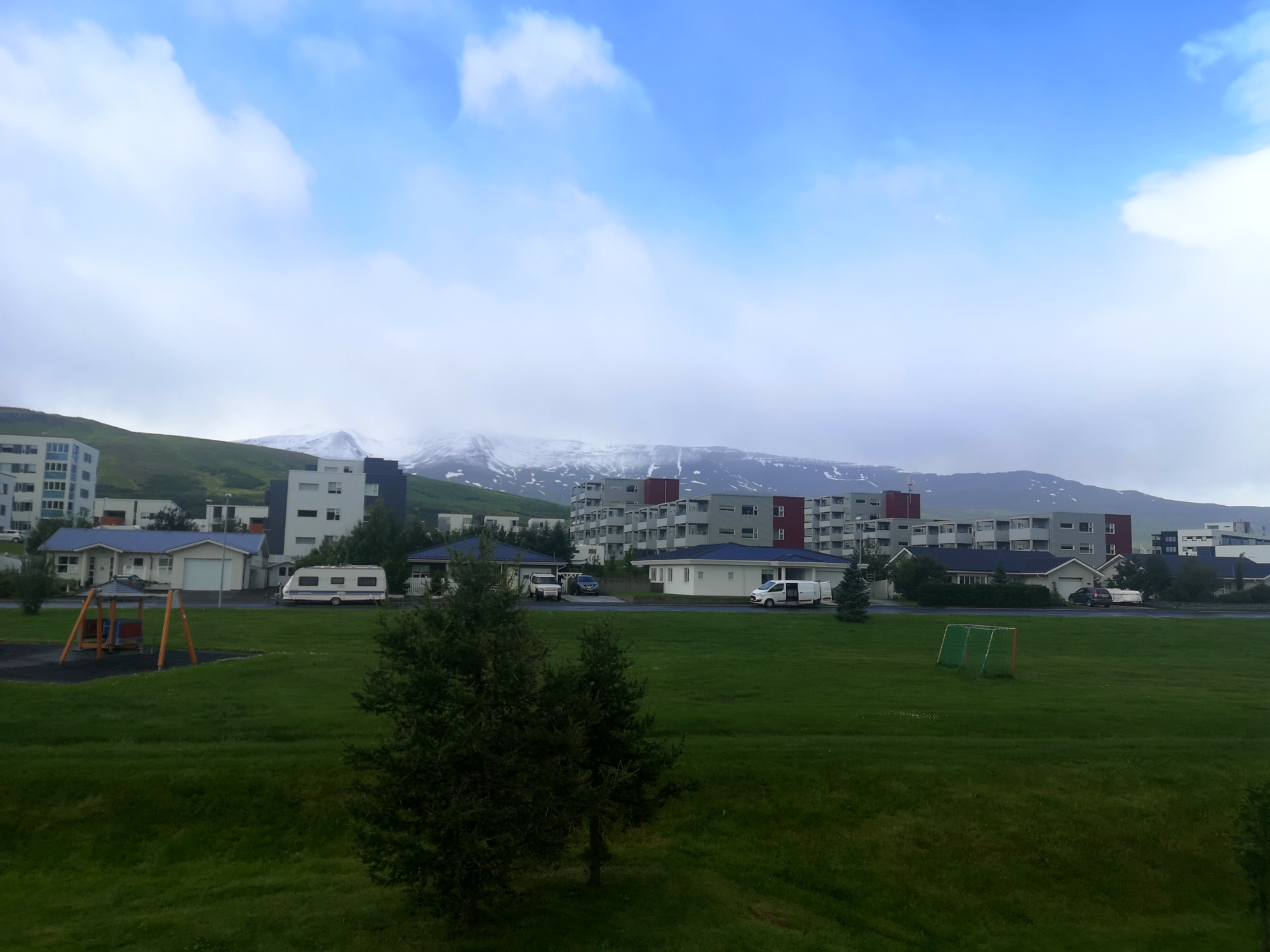 In a surprising turn of events, the mountains surrounding Akureyri were covered with snow this morning, an unusual sight for July (snow line at around 700m a.b.s.l). This rare weather phenomenon comes as a yellow weather warning has been issued across Iceland, underscoring severe weather conditions affecting different parts of the country.