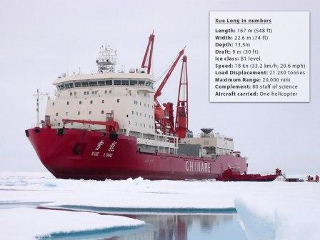 The Xuelong is 167m long, almost 23 meters wide and the ice class is B1 level, it can break through 1.1m of ice, including 20cm of snow by 1,5 knots continuously.