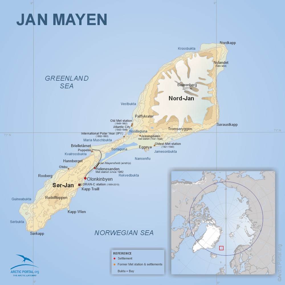 Jan Mayen is a remote Norwegian island located at 71°N/8°W in the Arctic Ocean, about 600 kilometers northeast of Iceland, 500 km east of Greenland, and approximately 1000 km west of Norway.